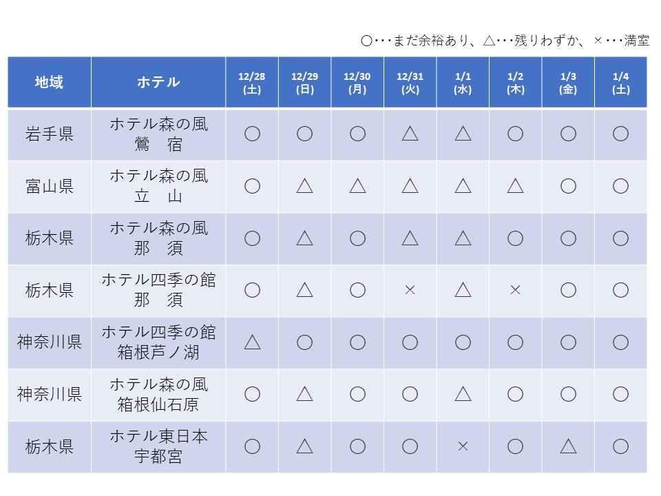 日本ハウス・ホテル&リゾート 全グループの年末年始期間(12/28~1/4) の空室状況をお知らせ致します。