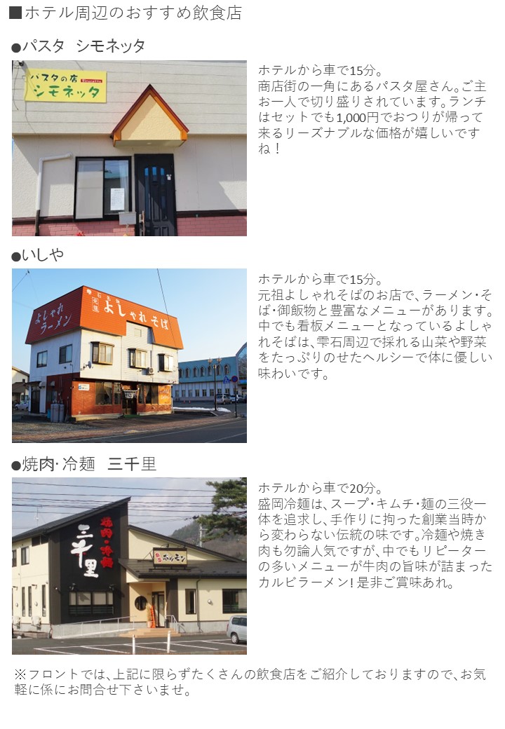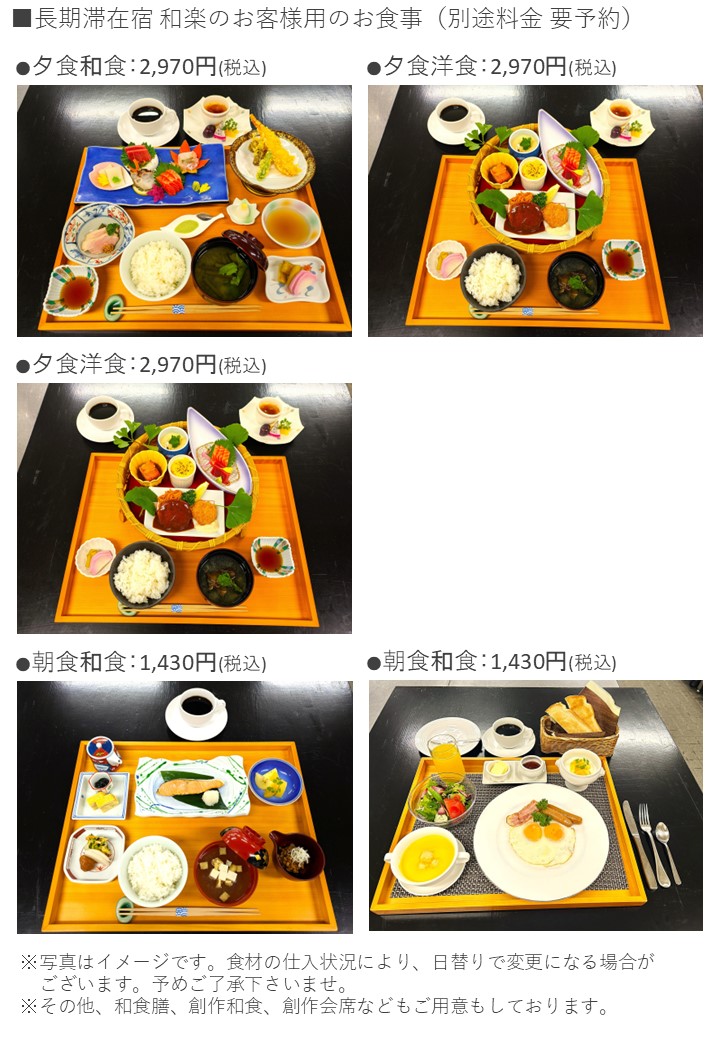 ※本プランにはお食事は含まれておりません。ご希望の方には長期滞在宿和楽用の各種お料理もご用意しております。また、周辺飲食店(人気店、郷土料理)などもご案内もしております。